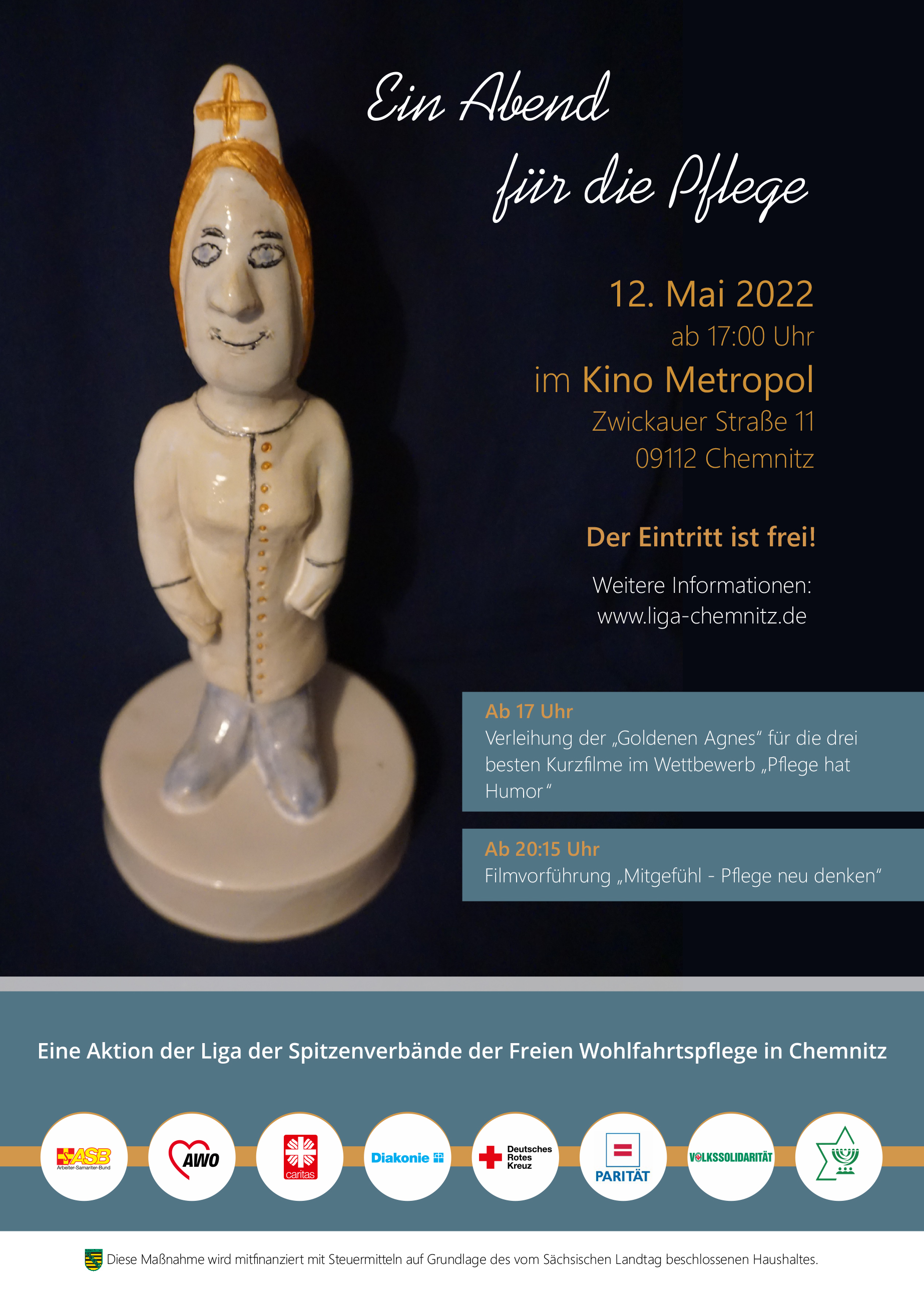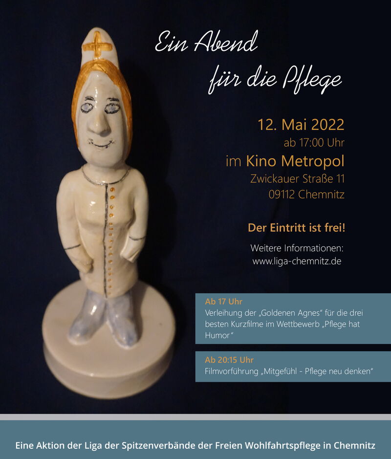 Im Vorfeld der Veranstaltung haben wir in den Verbänden und Pflegeschulen in Chemnitz zu einem Videowettbewerb aufgerufen. Das Motto: „Pflege hat Humor – wir zeigen es!“ Die eingereichten Kurzfilme werden an diesem Abend präsentiert und vom Publikum die drei besten Beiträge direkt vor Ort gewählt. Als Trophäe für die Teilnehmenden lockt die „Goldene Agnes“, eine Figur, die wir in Anlehnung an Agnes Karll ins Leben gerufen haben. Agnes Karll (1868-1927) war Krankenschwester und gilt als Reformerin der deutschen Krankenpflege. Wir wollen zeigen, dass Pflege nicht nur anstrengend und ernst ist, sondern dass die Arbeit in der ambulanten und stationären Pflege auch durch lustige, bemerkenswerte oder charmante Situationen geprägt ist. Die Vorführung und Prämierung der Kurzfilme ist in ein kurzweiliges Rahmenprogramm eingebettet. Der Abend wird durch den Film „Mitgefühl – Pflege neu denken“ abgerundet. Die Veranstaltung ist kostenfrei und offen für alle Interessierten gemäß der dann geltenden Corona-Schutz-Verordnung.